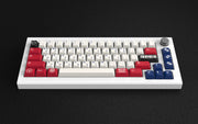 PANTONE 186 C (RED) and PANTONE 294 C (BLUE), while adding GMK's WS1 (WHITE) to be the balance between those 2 bold colors.